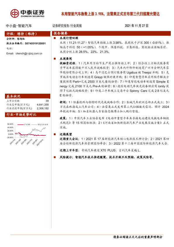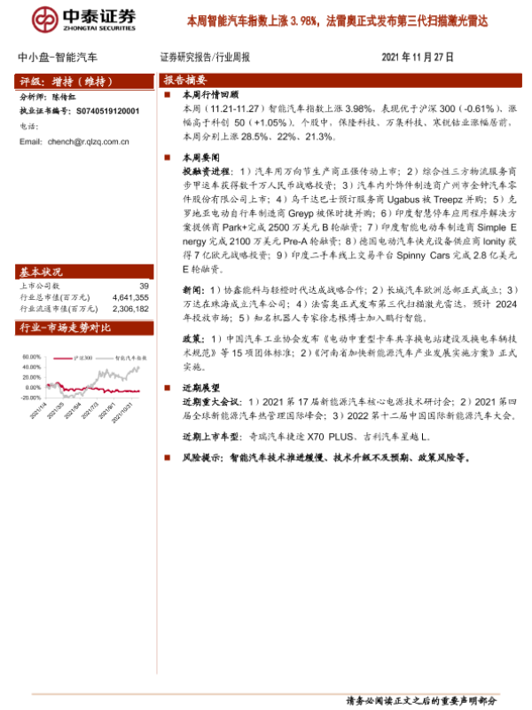 【中泰证券】【20211127】20211127-中泰证券-智能汽车:本周智能汽车指数上涨3.98%,法雷奥正式发布第三代扫描激光雷达-8页