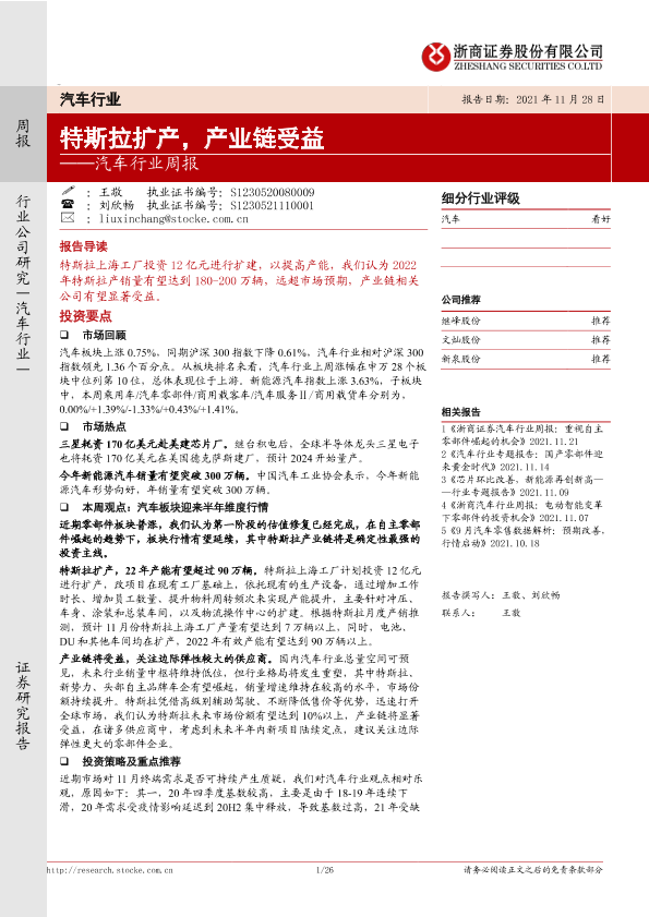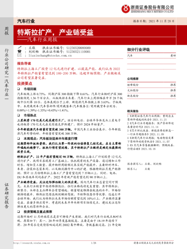 【浙商证券】【20211128】汽车行业周报:特斯拉扩产,产业链受益-26页