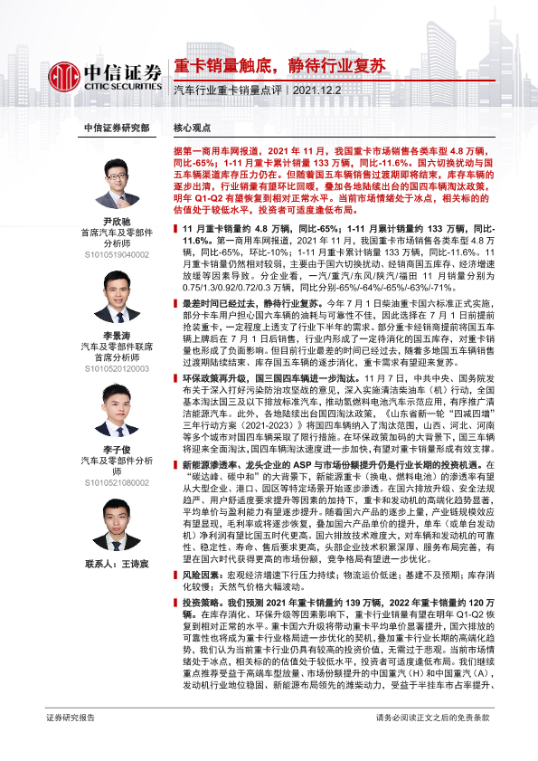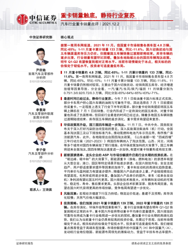 【中信证券】【20211202】汽车行业重卡销量点评:重卡销量触底,静待行业复苏-4页