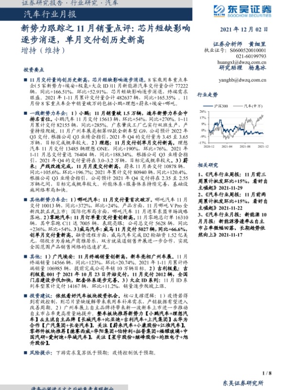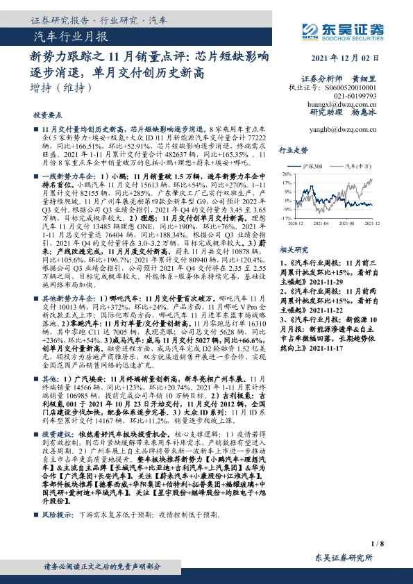 【东吴证券】【20211202】20211202-东吴证券-汽车行业月报:新势力跟踪之11月销量点评:芯片短缺影响逐步消退,单月交付创历史新高-8页