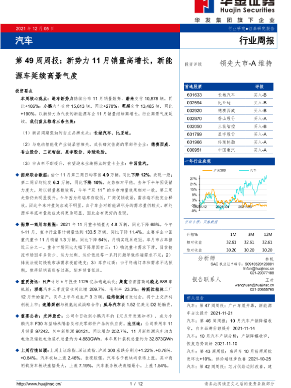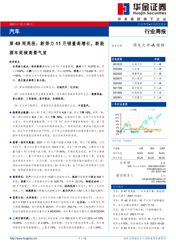 【华金证券】【20211205】汽车第49周周报:新势力11月销量高增长,新能源车延续高景气度-12页