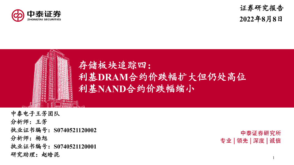 【中泰证券】【20220808】电子行业存储板块追踪四:利基DRAM合约价跌幅扩大但仍处高位,利基NAND合约价跌幅缩小-46页