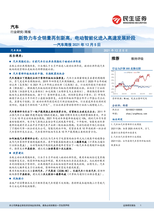投资建议 汽车销量 电动智能化 零部件配置机会 风险提示