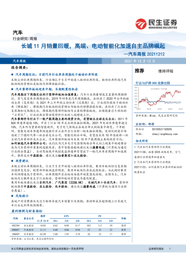 【民生证券】【20211212】汽车周报:长城11月销量回暖,高端、电动智能化加速自主品牌崛起-26页