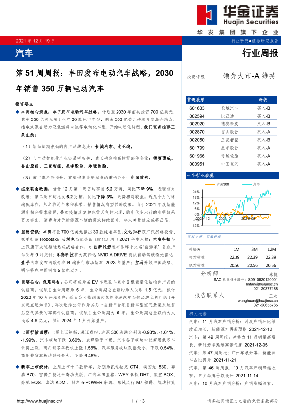 【华金证券】【20211219】汽车第51周周报:丰田发布电动汽车战略,2030年销售350万辆电动汽车-13页