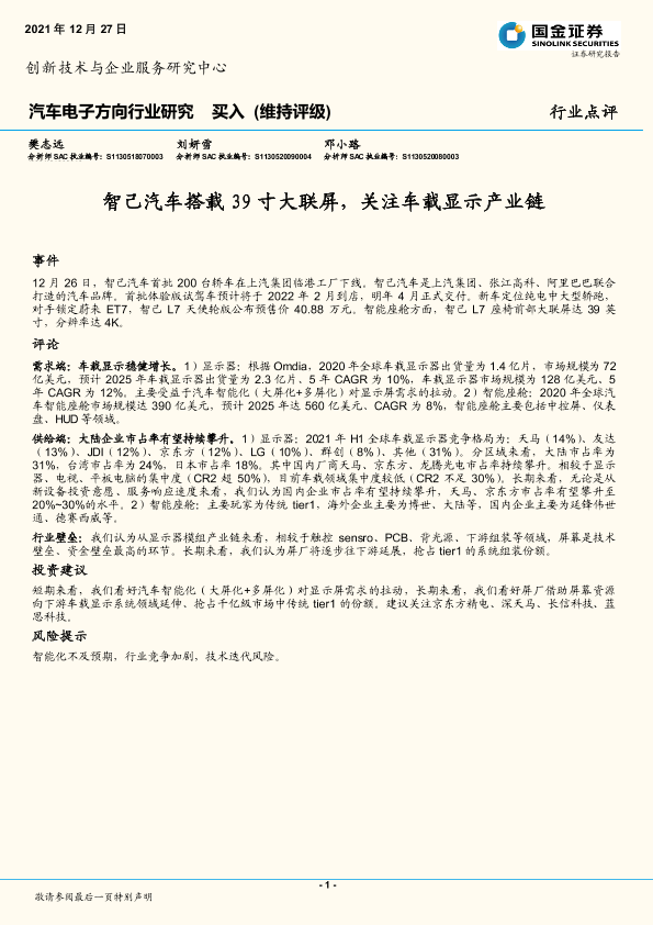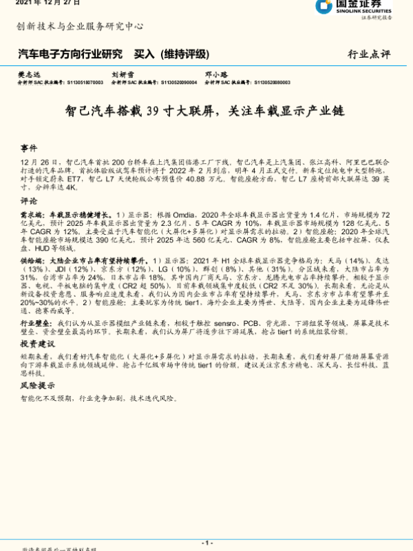 【国金证券】【20211227】汽车电子方向行业点评:智己汽车搭载39寸大联屏,关注车载显示产业链-3页
