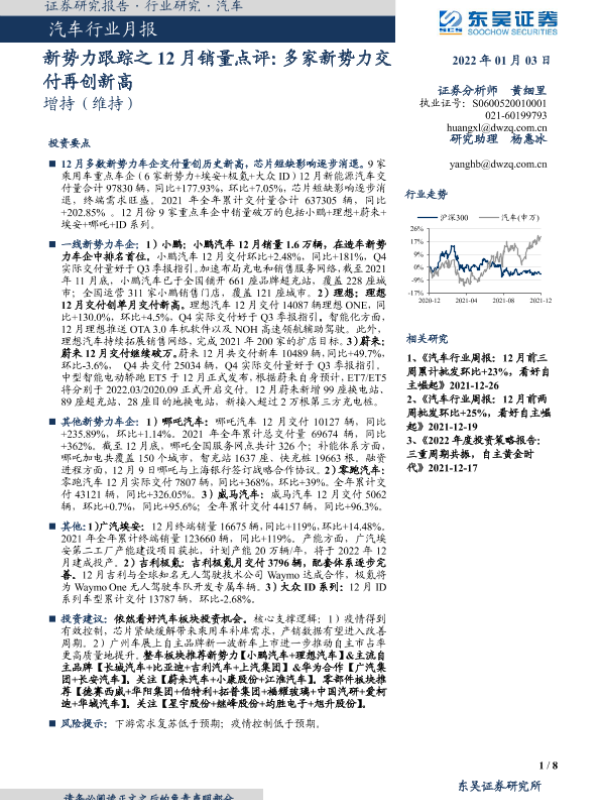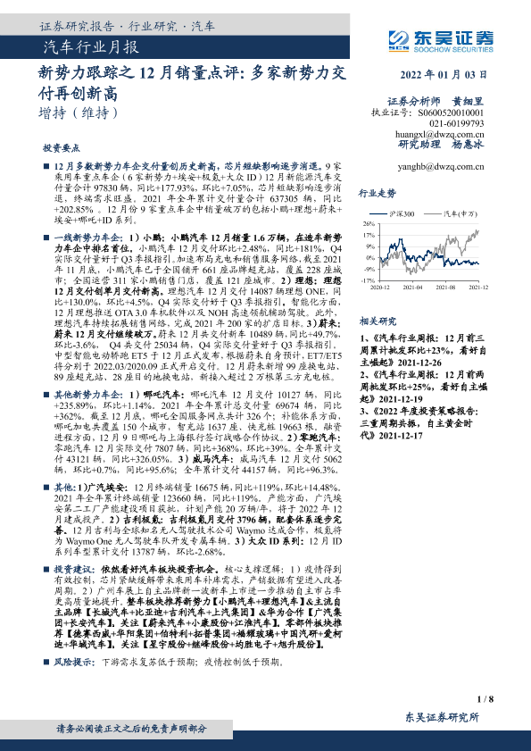 【东吴证券】【20220103】20220103-东吴证券-汽车行业月报:新势力跟踪之12月销量点评:多家新势力交付再创新高-8页