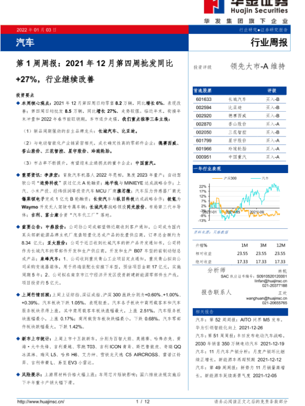 【华金证券】【20220103】2022年01月03日汽车第1周周报:2021年12月第四周批发同比+27%,行业继续改善-12页
