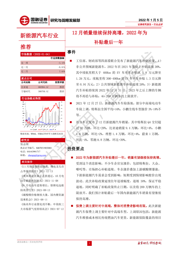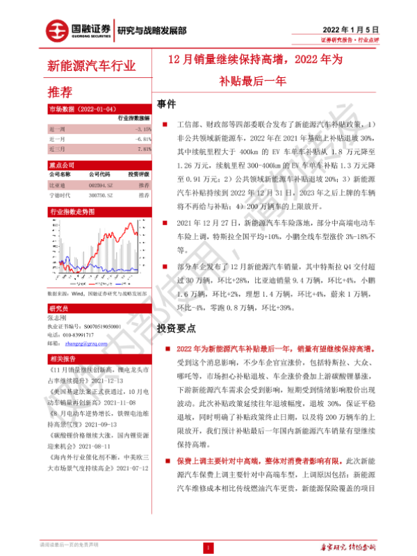 【国融证券】【20220105】新能源汽车行业:12月销量继续保持高增,2022年为补贴最后一年-3页