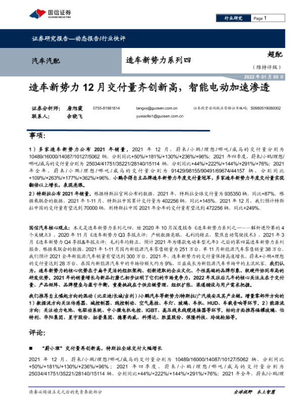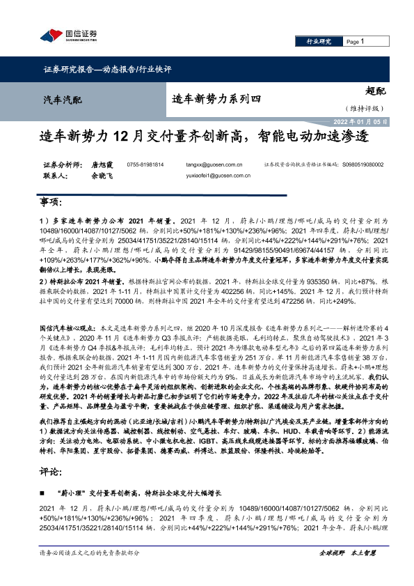 【国信证券】【20220105】汽车汽配:造车新势力系列四-造车新势力12月交付量齐创新高,智能电动加速渗透-9页