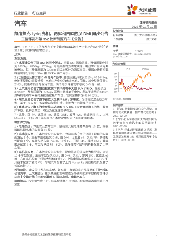 【天风证券】【20220110】工信部发布第352批新能源汽车《公告》:凯迪拉克Lyriq亮相,两驱和四驱的汉DMi同步公告-4页