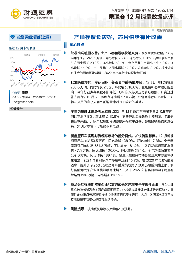 【财通证券】【20220114】乘联会12月销量数据点评:产销存增长较好,芯片供给有所改善-3页