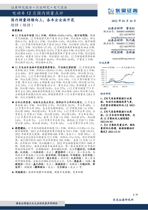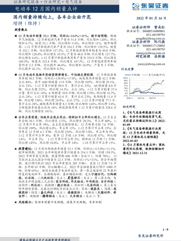 【东吴证券】【20220116】电动车12月国内销量点评:国内销量持续向上,各车企全面开花-9页