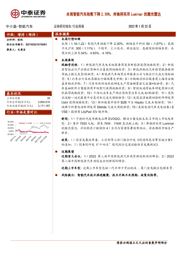 【中泰证券】【20220122】20220122-中泰证券-智能汽车:本周智能汽车指数下降2.30%,奔驰将采用Luminar的激光雷达-8页