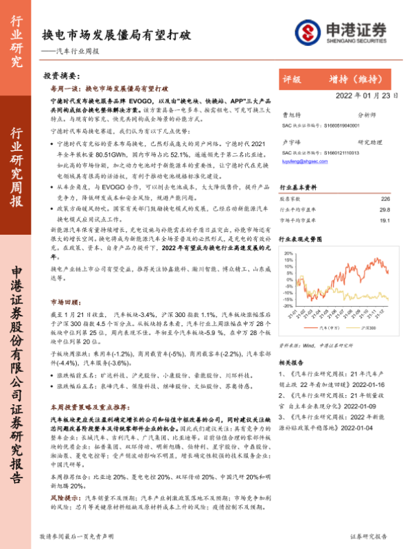 【申港证券】【20220123】换电市场发展僵局有望打破——汽车行业周报-12页