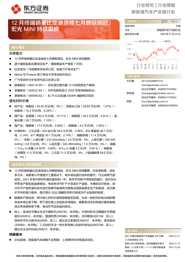 【东方证券】【20220124】新能源汽车产业链行业周报:12月终端销量比亚迪连续七月蝉联销冠,宏光MINI持续霸榜-27页