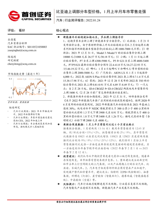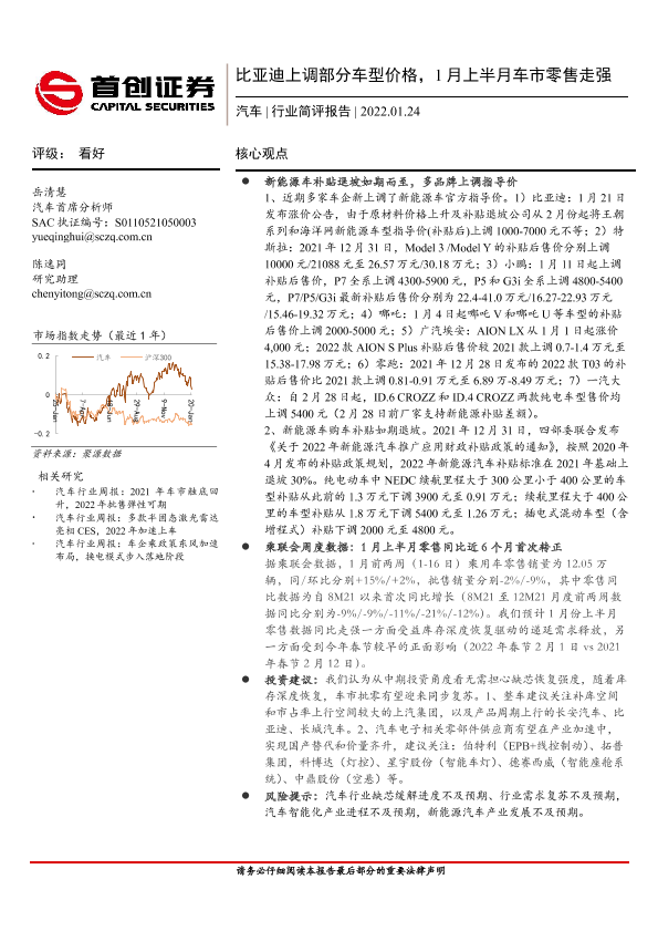 【首创证券】【20220124】20220124-首创证券-汽车行业简评报告:比亚迪上调部分车型价格,1月上半月车市零售走强-10页