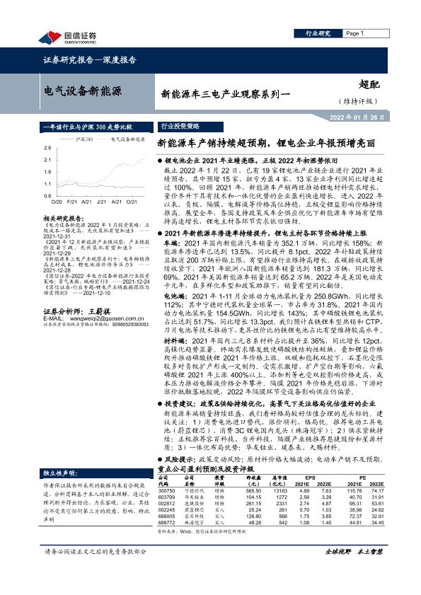 【国信证券】【20220126】新能源车三电产业观察系列一:新能源车产销持续超预期,锂电企业年报预增亮丽-40页