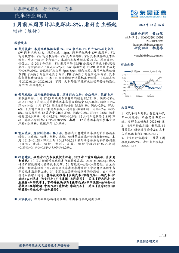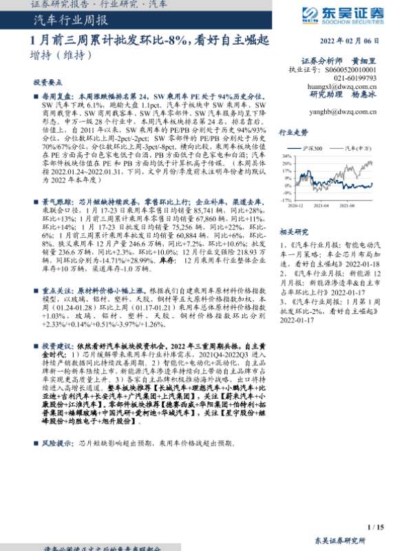 【东吴证券】【20220206】20220206-东吴证券-汽车行业周报:1月前三周累计批发环比-8%,看好自主崛起-15页
