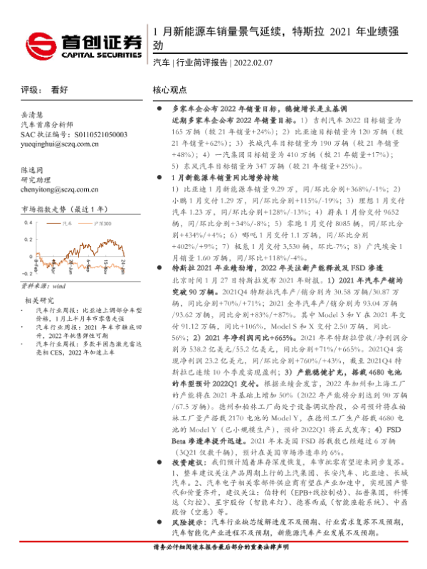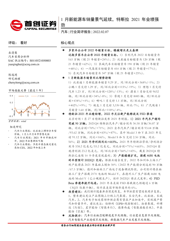 【首创证券】【20220207】20220207-首创证券-汽车行业简评报告:1月新能源车销量景气延续,特斯拉2021年业绩强劲-10页