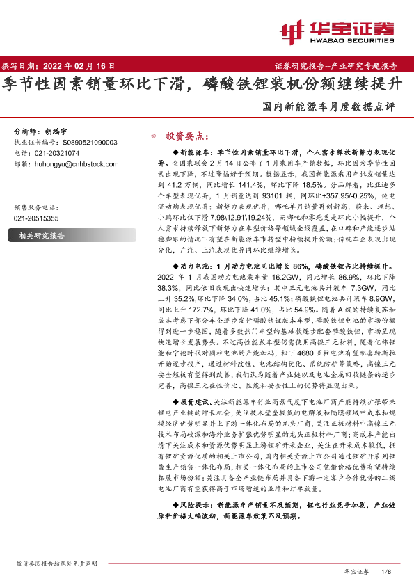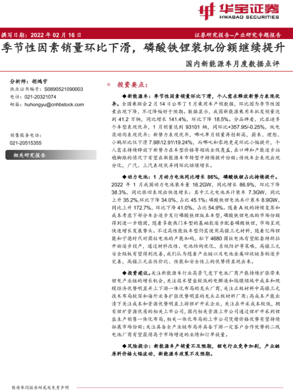 【华宝证券】【20220216】国内新能源车月度数据点评:季节性因素销量环比下滑,磷酸铁锂装机份额继续提升-8页