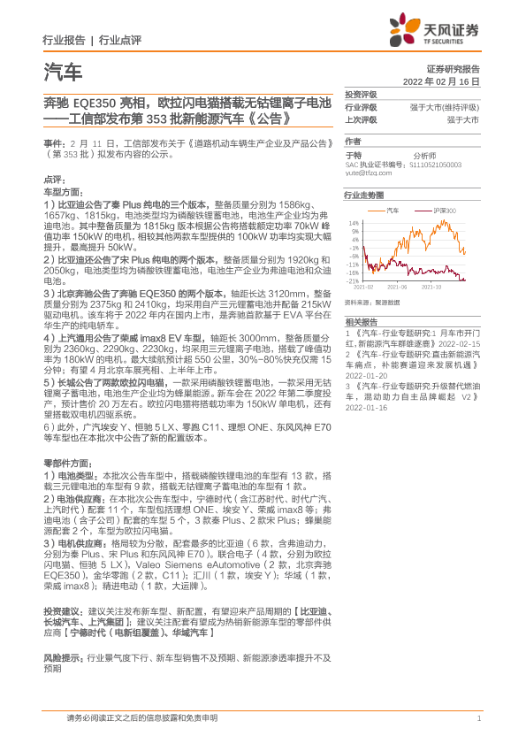 【天风证券】【20220216】汽车行业点评:工信部发布第353批新能源汽车《公告》-奔驰EQE350亮相,欧拉闪电猫搭载无钴锂离子电池-4页