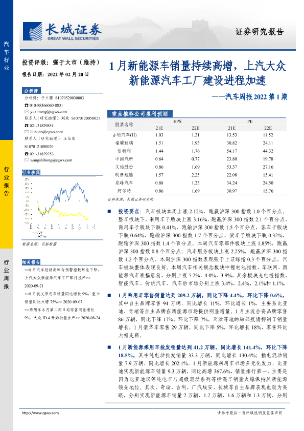 【长城证券】【20220220】汽车周报2022第1期:1月新能源车销量持续高增,上汽大众新能源汽车工厂建设进程加速-13页