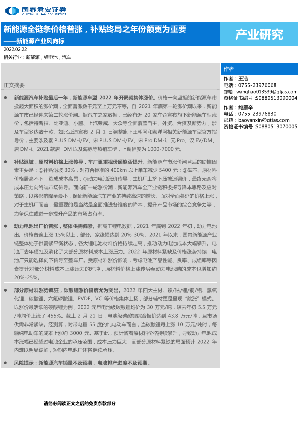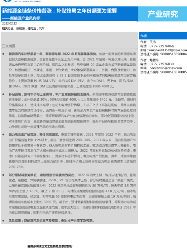 【国泰君安证券】【20220222】新能源产业风向标:新能源全链条价格普涨,补贴终局之年份额更为重要-2页
