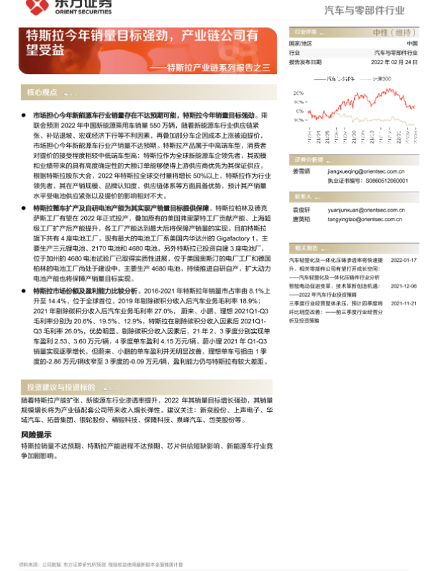 【东方证券】【20220224】汽车与零部件行业:特斯拉产业链系列报告之三:特斯拉今年销量目标强劲,产业链公司有望受益-18页