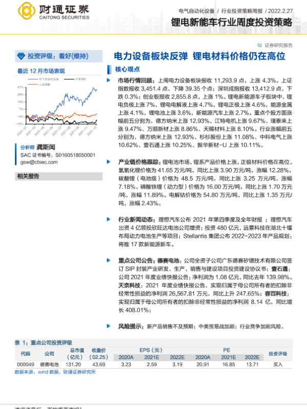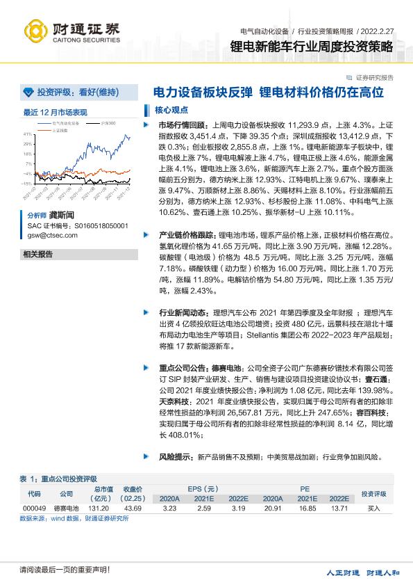 【财通证券】【20220227】锂电新能车行业周度投资策略:电力设备板块反弹 锂电材料价格仍在高位-19页