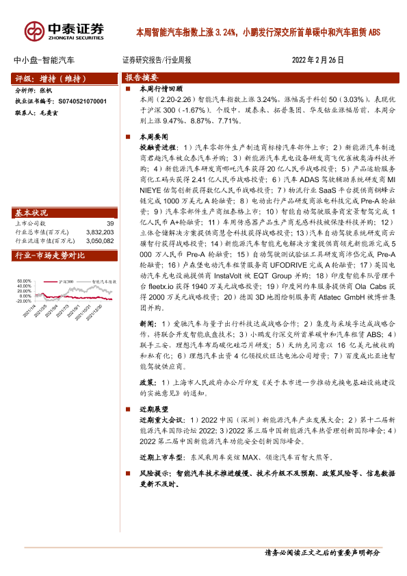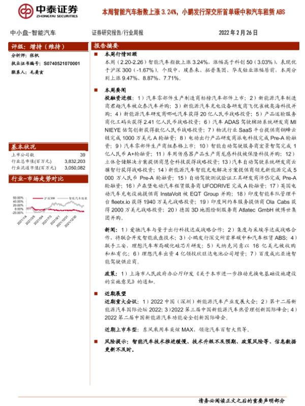 【中泰证券】【20220226】20220226-中泰证券-中小盘-智能汽车行业周报:本周智能汽车指数上涨3.24%,小鹏发行深交所首单碳中和汽车租赁ABS-9页