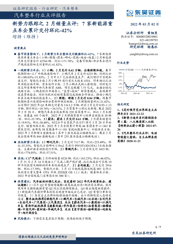 【东吴证券】【20220302】汽车整车行业点评报告:新势力跟踪之2月销量点评:7家新能源重点车企累计交付环比-42%-7页