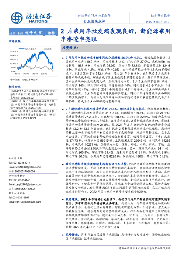 【海通证券】【20220309】20220309-海通证券-汽车与零配件行业信息点评:2月乘用车批发端表现良好,新能源乘用车渗透率亮眼-2页