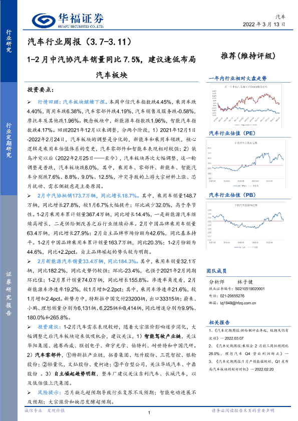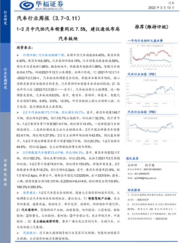 【华福证券】【20220313】20220313-华福证券-汽车行业周报:1-2月中汽协汽车销量同比7.5%,建议逢低布局汽车板块-8页