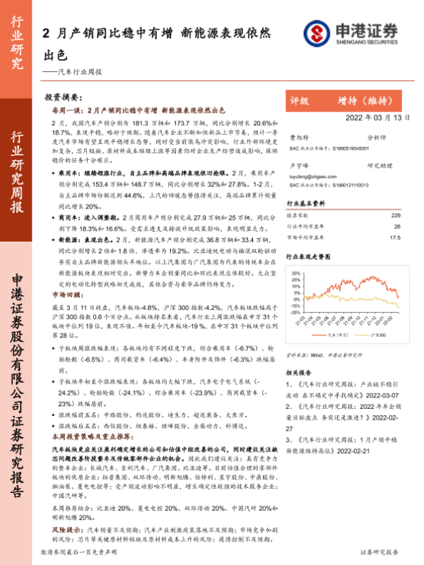 【申港证券】【20220313】20220313-申港证券-汽车行业周报:2月产销同比稳中有增 新能源表现依然出色-17页
