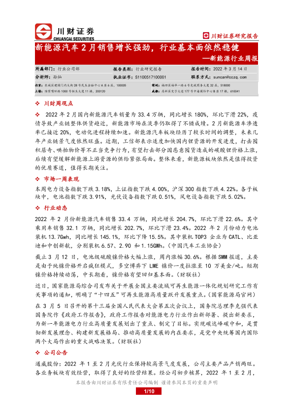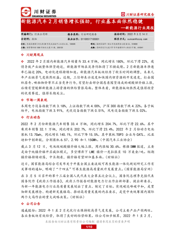 【川财证券】【20220314】20220314-川财证券-新能源行业周报:新能源汽车2月销售增长强劲,行业基本面依然稳健-10页
