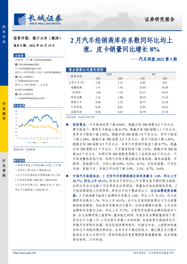 【长城证券】【20220319】汽车周报2022第5期:2月汽车经销商库存系数同环比均上涨,皮卡销量同比增长8%-14页