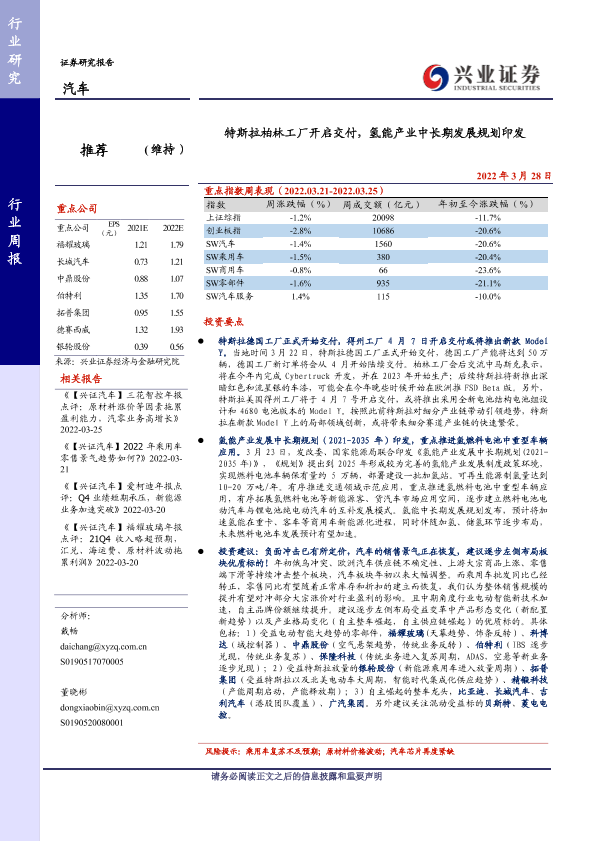 【兴业证券】【20220328】20220328-兴业证券-汽车行业周报:特斯拉柏林工厂开启交付,氢能产业中长期发展规划印发-30页