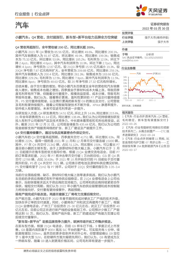 【天风证券】【20220330】小鹏汽车:Q4营收、交付超指引,新车型+新平台助力品牌全方位突破-4页