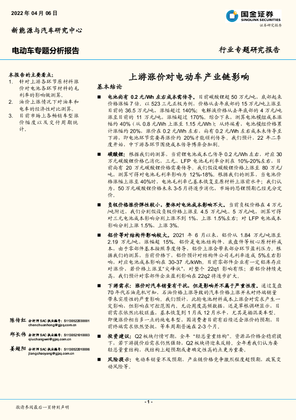 【国金证券】【20220406】电动车专题分析报告:上游涨价对电动车产业链影响-18页