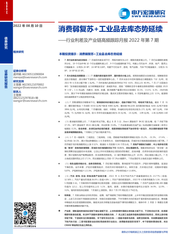 【申万宏源】【20220810】行业利差及产业链高频跟踪月报2022年第7期:消费弱复苏+工业品去库态势延续-25页