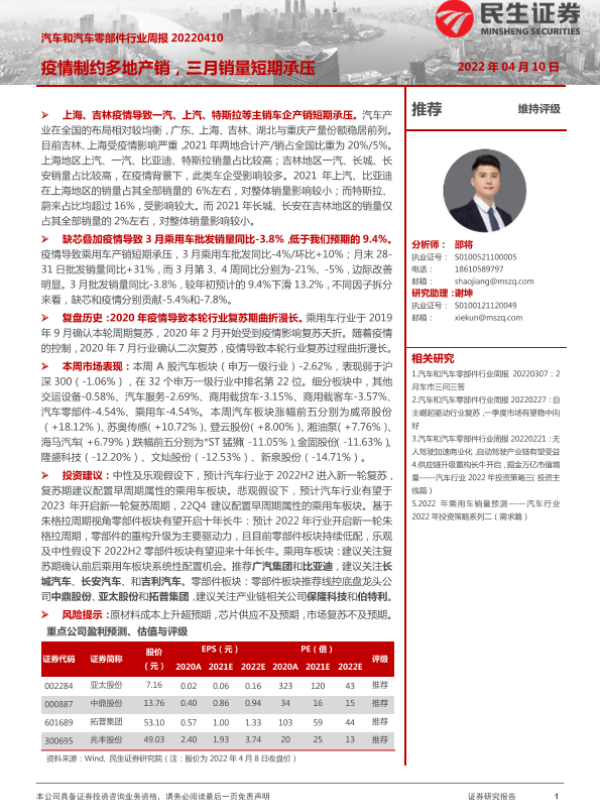 【民生证券】【20220410】汽车和汽车零部件行业周报:疫情制约多地产销,三月销量短期承压-24页