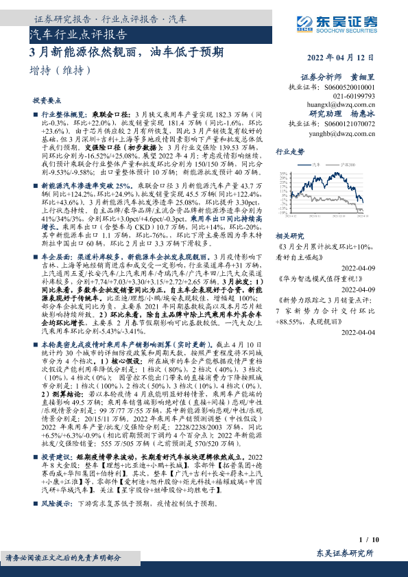 【东吴证券】【20220412】3月新能源依然靓丽,油车低于预期-10页