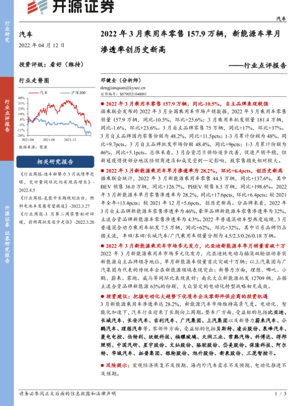 【开源证券】【20220412】2022年3月乘用车零售157.9万辆,新能源车单月渗透率创历史新高-3页