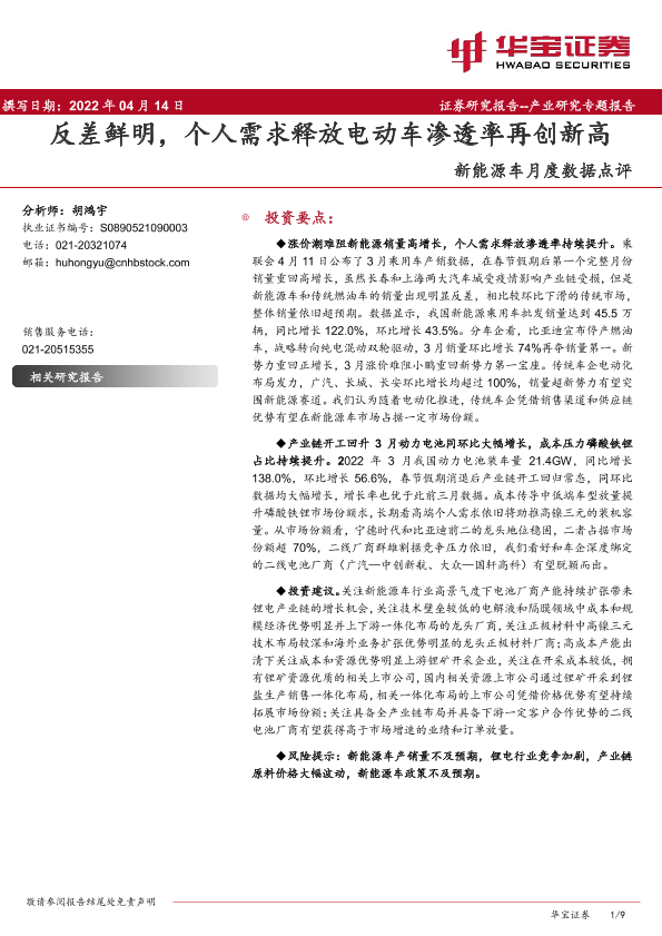 【华宝证券】【20220414】20220414-华宝证券-新能源车月度数据点评:反差鲜明,个人需求释放电动车渗透率再创新高-9页