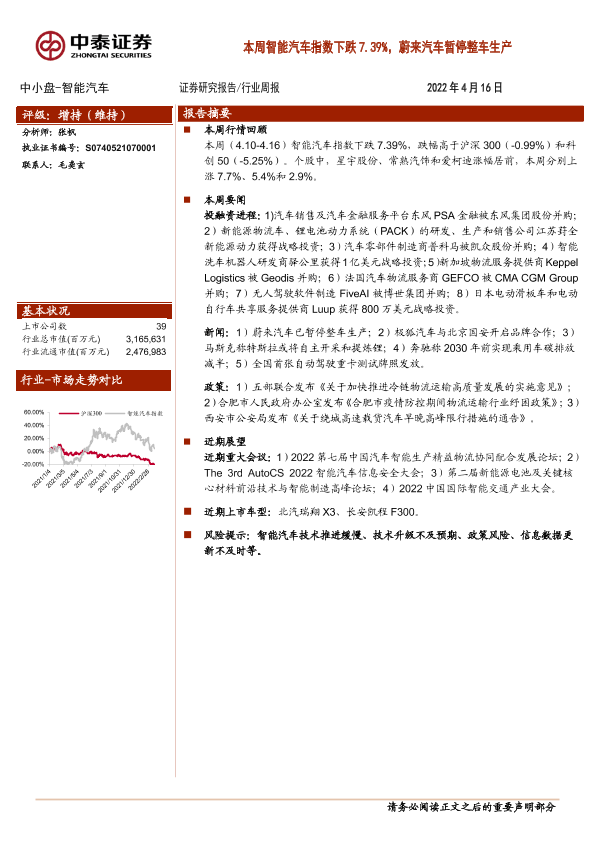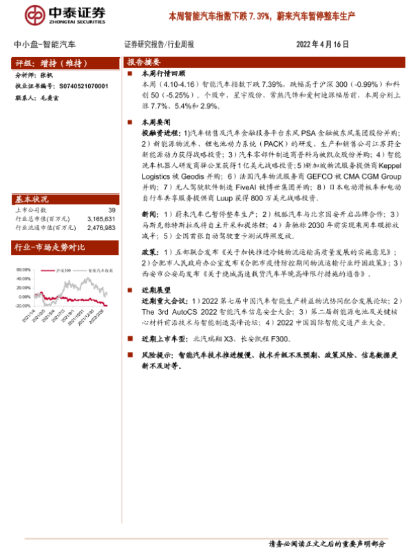 【中泰证券】【20220416】20220416-中泰证券-中小盘-智能汽车行业周报:本周智能汽车指数下跌7.39%,蔚来汽车暂停整车生产-8页