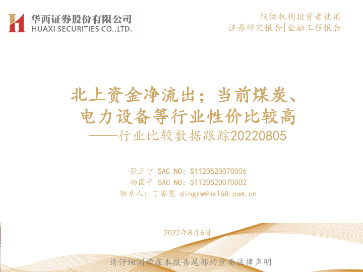 【华西证券】【20220806】行业比较数据跟踪:北上资金净流出;当前煤炭、电力设备等行业性价比较高-24页