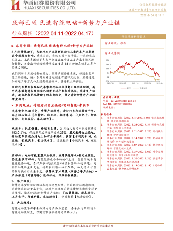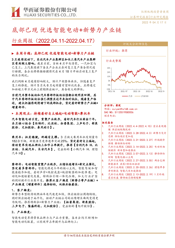 【华西证券】【20220417】20220417-华西证券-汽车行业周报:底部已现 优选智能电动+新势力产业链-29页