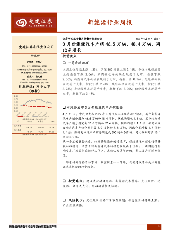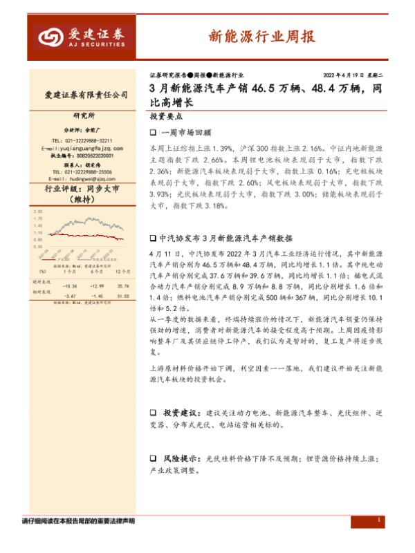 【爱建证券】【20220419】20220419-爱建证券-新能源行业周报:3月新能源汽车产销46.5万辆、48.4万辆,同比高增长-12页