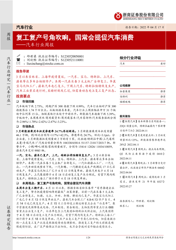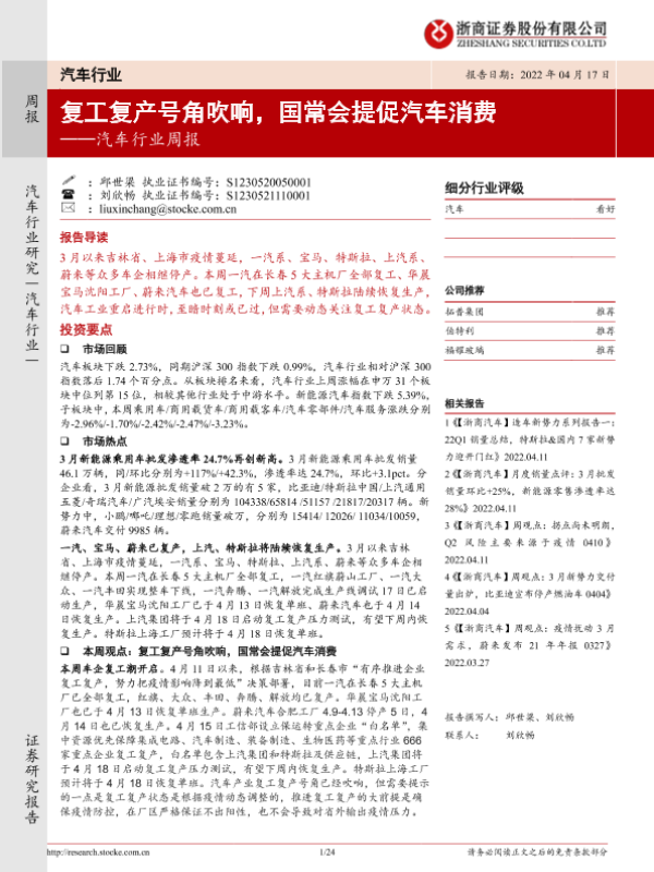 【浙商证券】【20220417】20220417-浙商证券-汽车行业周报:复工复产号角吹响,国常会提促汽车消费-24页
